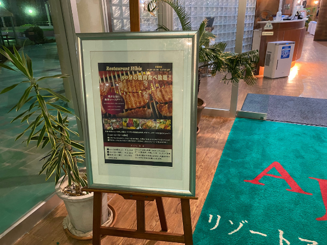夕食:90分焼き肉食べ放題ブッフェ:レストラン「ハイビス」で、窓いっぱいに海が映る席を選びました。
