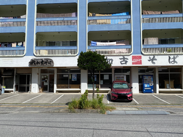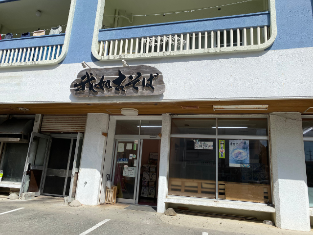 店の前には大きく「我如古そば」と書かれた看板が立っていて、初めて訪れる人にもわかりやすい雰囲気。